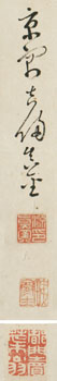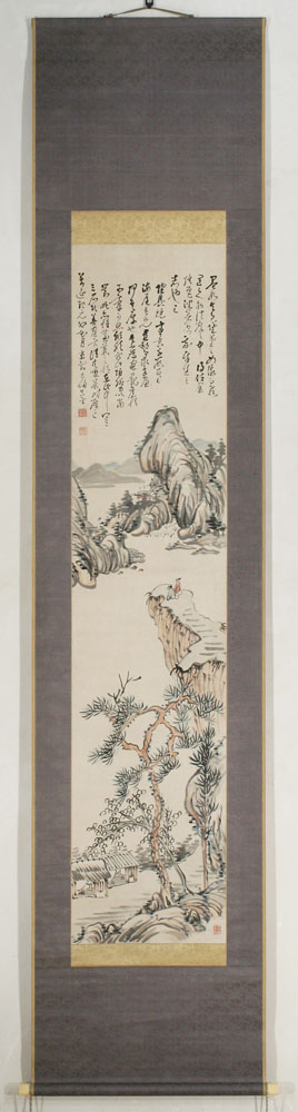 | Fujimoto Tesseki (1817-1863) Nanga LandscapeSigned: Miyakogû (’from the capital’) Kichibei Makane Seals: Gen Makane noin, Tekkanshi, Tomon Baisai okina Technique: colours on paper 134.9 x 29.8 Date: 1860 Mounting: taub brocade 208 x 45 Condition: very good The inscription remains unread The importance of Tesseki as a painter has been overshadowed by his political career and his romantic death as a martyr. Tesseki was born into a samurai family from Okayama. From childhood he studied literature, poetry and calligraphy, Chinese as well as Japanese and the Chinese Sung style of painting, but also military tactics and martial arts. Around the age of 25 he went to Osaka and later to Kyoto. His military education, which he received in Kyoto, resulted in the rank of master swordsman. Like many young intellectuals at that time, he went on a journey and studied at the Kangien, a school for (Neo-)Confucian studies. He returned to Kyoto in 1851. After Ii Naosuke (1815-1860), the head councillor of the shogunate had signed the treaty with the foreigners, and the imperial princess Kazu (1846-1877) had married the 14th shogun Tokugawa Iemochi (1846-1866) in a political alliance in 1862, Tesseki became a violent imperialist. He joined several raids and was killed in 1863 at Nara in a fight against the soldiers of the Kishu Clan. Reference: Berry & Morioka ’08 p. 254-56 (# 65, 76) Kato ’98 (chapter 1) # 128-137 Addiss '83 pp. 198-199 Roberts p. 177 Araki p. 2749 Nagasawa # 3858 Price: SOLD ![]() | |