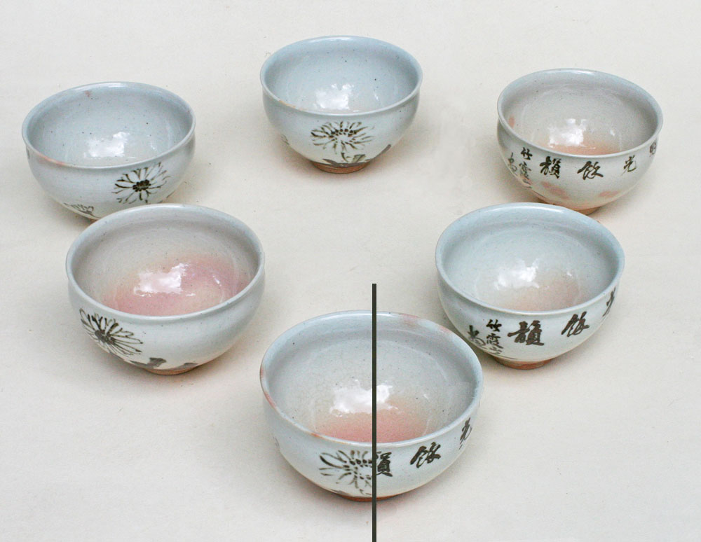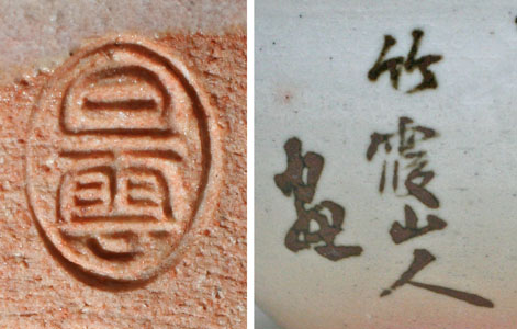 | Hirao Chikka (1856-1939) & Hakuun (dates unknown) Kyôyaki Set of 6 chawan, tea bowls - Kiku, chruysanthemumsSigned: Chikka Sanjin ga Seals: Hakuun Technique: grey pink gohonde Kyôyaki with a brown tetsu-e underglaze painting and calligraphy Ø 9.8 x 6 Condition: fine inscription reads: 明光綷韻 Meikô suiin, shining light pure elegance (Tamba Sasayama tea ware) Chikka was born as the son of a potter in the service of the kiln of the daimyô of Sasayama, Tanba prefecture (present day Hyôgu). In Kyoto Chikka became a pupil of the Shijô school painter Shiokawa Bunrin (1808-1877). After his death Chikka studied with the Nanga painter Tanômura Chokunyû (1814-1907). He traveled extensively on his own as well with his teacher, to absorb the various local traditions. He was a founding member of the Nihon Nanga-in organization of painters and an important Nanga painter in the Taishô and early Shôwa years Reference: Aburai p. 325 Araki p. 665 Price: EUR 500 / USD 590 ![]() |
