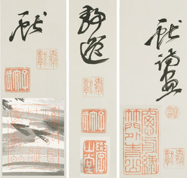 | Shinten'ô (1823-1885) (Yamanaka Seiitsu) Nanga Triptych: 2 landscapes and a pine, rock and streamSigned: Ken shiga (r), Seiitsu (m) & Ken (l) Seals: Azana wa Bunshi, Ranken, .., gakuzandô (m), .. Technique: sumi on paper 131 x 47,9 (3x) Date: 1873 Mounting: cream damask 187,5 x 61,3 Box: inscribed Condition: creases, otherwise very good inscription remains unread 信天翁 Shinten'ô, “Albatross”, or read seperately “The old man who trusts in heaven”. was the go, pen name of Yamanaka Seiitsu. He was one of the key figures in the Kyoto literati world. Seiitsu was born into a well-to-do and rather intellectual farming family near Nagoya. He studied calligraphy with Shinozaki Shôchiku (1781-1851), but as a painter he was mainly self-taught. After his father’s death in 1848 he had to continue his studies at the local temple school. After the death of his younger brother his uncle sponsored his Confucian studies with Saitô Setsudô (1792-1865) for three years. Thereafter he studied Chinese literature with Yanagawa Seigan (1781-1859) and Umeda Unpin (1825-1865). With them he met with the royalists Rai Miisaburô and Fujimoto Tesseki (1817-1863) and they became friends. To avoid charges from the Bakufu he started to travel. As a former member of the anti-Bakufu Imperial Loyalist movement, he received important governmental posts after the Meiji restoration, but, not yet fifty years old, he retired to devote his time to art and literati gatherings in his luxurious villa in Arashima. Reference: Addiss 1993 Kato ‘98 first chapter Berry '01 p. 157-159 Hempel '98 pp. 169-170 Araki p. 1357 Price: EUR 2,000 / USD 2,480 ![]() |
