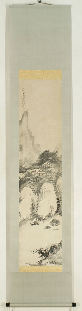 | Soga Shôhaku (1730-1781) Independant LandscapeSigned: Soga Kiyû ga Seals: Soga Kiyû, Shôhaku Technique: sumi on paper 117 x 27 Mounting: light grey-blue silk 190 x 38.5 Condition: fine Shôhaku was born in Kyoto to a merchant family. In his early twenties he studied with the old Kanô style painter Takada Keihô (1674-1755). Keihô's influence was profound, which must have helped him a lot, because his career was already set in his early thirties. His prolonged stay at Ise in 1758-1759 seemed to have made him popular there because he returned in 1764 and went to Harima in 1767. Some of his best work was made on these trips of which many commissions for Buddhist temples. Shôhaku was one of the three so-called independents, Shôhaku, Itô Jakuchû (1716-1800) and Nagasawa Rosetsu (1754-1799). He was a hell of a painter and a character. He felt undervalued which he compensated with bold and eccentric work as a result his contemporaries considered him mad and fanatic. He made up a number of fictitious descents from the Soga lineage up to the founder of the Ming dynasty making him 14th generation Emperor of China. It didn't really help. Shôhaku's work is a mixture of Kanô School painting, Soga, Unkoku, Muromachi and early Chinese paintings, often picturing Chinese subjects and Muromachi type landscapes done in broad ink washes in combination with detail. Shôhaku had no formal schooling, no (proven) cultural or historical lineage and after his early death no one to follow him in his art. Seems typical, makes it tragically. Reference: Chiba 1998 Kyoto 2005 Nihon no bijutsu kaiga kinshû vol. 23 Roberts p. 150 Rosenfield B 85 Berry 2001 p. 170 Kyoto '98 p. 282 Price: EUR 4,850 / USD 6,014 ![]() | |