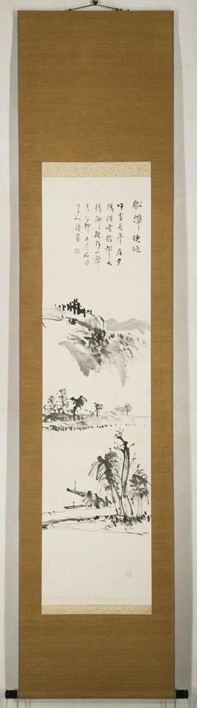 | Nagasaka Sekitai (1846-1925) Nihonga (Nanga) Watching boats on the water at nightSigned: Sekitai rôjin shiga Seals: Shû in & Sekitai (bottom) Technique: sumi on paper 131,8 x 34 Date: May 1905 Mounting: brown silk 212 x 48,2 Condition: very good 白雪長年屋 / 夕陽橫老舲 / 煙生水楊柳 / 欸乃一聲青。 Snow on the roofs the whole year long. The evening sun slants across old passenger boats. The willows along the water loom out of the mist. The sound of oars behind the verdure. Nagasaka Sekitai (Shûni) was a medical doctor and known as a calligrapher and a poet of Chinese poetry. He studied with Mori Shuntô (1819-1889) and became one of his best pupils (the four heavenly kings). In 1875 he moved to Tokyo starting as a doctor and working in the house where Yanagawa Seigan (1781-1858) once lived. Reference: Araki p. 483 Price: EUR 650 / USD 806 ![]() | |