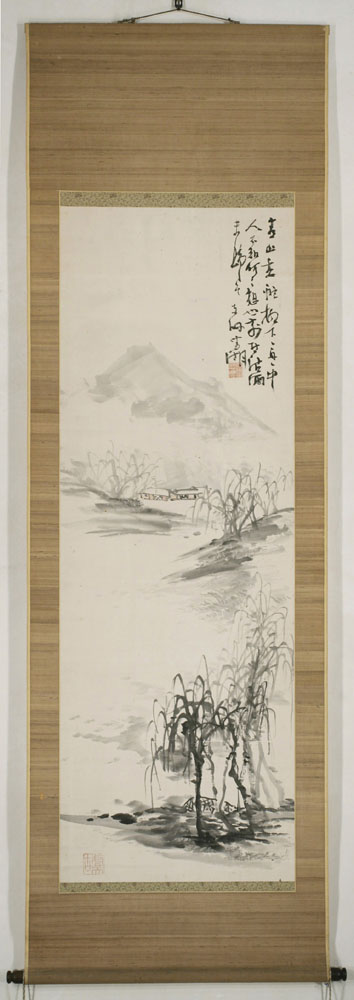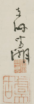 | Okuhara Seiko (1837-1913) Nanga Willow landscapeSigned: Tôkai Seiko Seals: Kômori kômori sakusa kenshô chokkô, Gukô Technique: sumi and a little pink on paper 135 x 47,2 Mounting: bronze silk 192,5 x 60,5 Condition: good The inscription remains unread Okuhara Seiko was an independent unconventional female artist, one of the two leading female artists of the Meiji period. She was the fourth daughter of a high-ranking samurai family in Koga, Ibaraki prefecture. Next to her masculine training in martial arts, she received a proper female education and received lessons from the Chinese style poet Onuma Chinzan (1818-91), Hirata Suiseki (1796-1863), who was a follower of Tani Bunchô, the calligrapher Oyama Kagai (1785-1864) and the rangaku (Western learning) scholar Takami Senseki (1785-1858). Her desire to pursue a painting career in Edo ran contrary to clan laws restricting women's travel. Through her adoption by the Okuhara family she overcame this obstacle and moved to Edo in 1865. Seiko quickly established herself at the foreground of Tokyo art and literary circles, and she even managed to get an invitation for an audience with the empress in 1872, the first female artist ever to receive such an honour. During the 1870s and 1880s Seiko’s career flourished. It is said she trained hundreds of pupils at her school in Shitaya. Highly appraised colleagues like Yasuda Rôzan (1830-82) and Hakuryû paid her visits to exchange ideas. After her studio had to move in favour of a railway, and when taste moved to western aesthetics, she retired at Kumagaya in 1891. During the two following decades after her retirement she traveled extensively. Reference: Koga 1998 Mito 2001 Fister ‘88 p. 161 ff. Berry & Morioka ’08 p. 291-92 Jordan & Weston p. 116 ff. Hempel (# 41.14) Price: SOLD ![]() | |